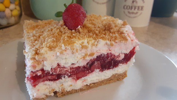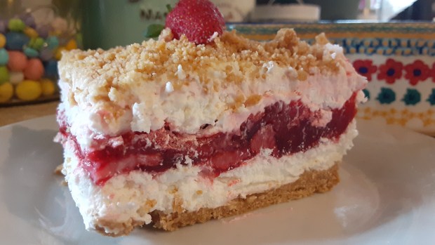 - Add a single layer of the cream cheese mix over the crust and spread evenly, add the COOLED berry mix and spread evenly. Add the rest of the cream cheese mixture then top with extra cool whip , if desired, then garnish with the 4 tablespoons of remaining crust.