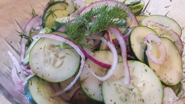 I know Fall is on the horizon, but I am not quite ready to let go of all those Summer flavors. With the help of my pal Vanessa, I have created this yummy cucumber side. Now mine is spicy because I used hot pepper vinegar, but you can easily add red pepper flakes, or simply omit them and use plain vinegar… now matter how you make it, its yummy… for me, it’s all about that Italian Seasoning!!