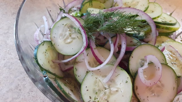 I know Fall is on the horizon, but I am not quite ready to let go of all those Summer flavors. With the help of my pal Vanessa, I have created this yummy cucumber side. Now mine is spicy because I used hot pepper vinegar, but you can easily add red pepper flakes, or simply omit them and use plain vinegar… now matter how you make it, its yummy… for me, it’s all about that Italian Seasoning!!